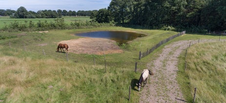 In het Paddockparadijs hebben we het drinken op grondniveau nagebootst door een poel te graven. Naast de poel hebben we een zandplaats gecreëerd zodat de paarden na het spetteren en baden in het zand kunnen rollen.